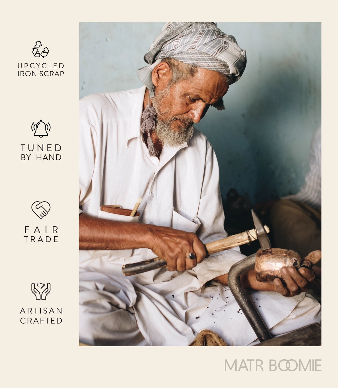 These small handcrafted bell, feature a wooden clapper and sturdy top loop. String together to make a hanging or a festive wreath or use individual bells to elevate your gift wrapping. These bells are also known as Noah or cow bells. They are hand tuned to perfection with a calming meditative sound. These bells can also work as hangings, door knob bells, and ornaments.
