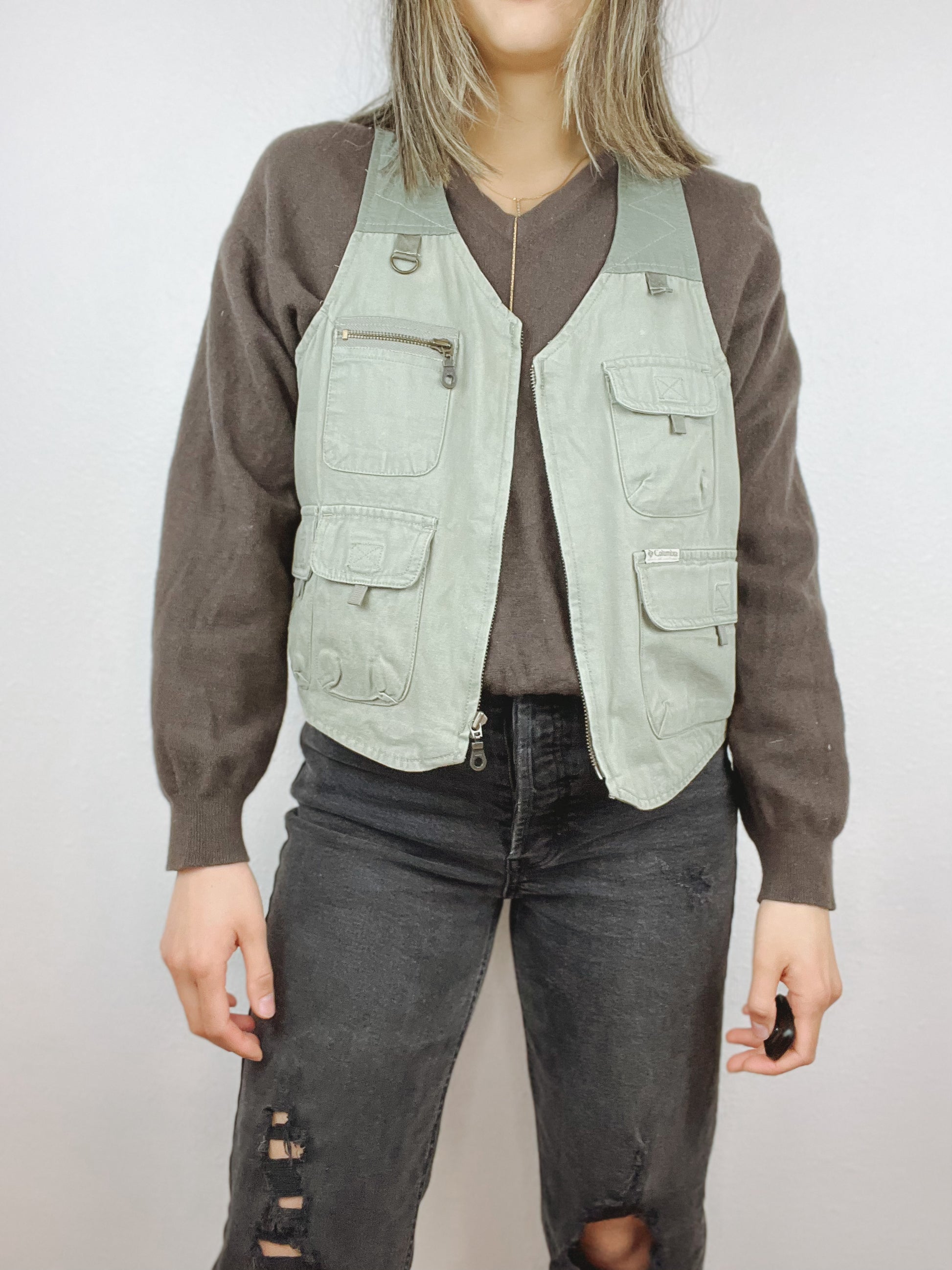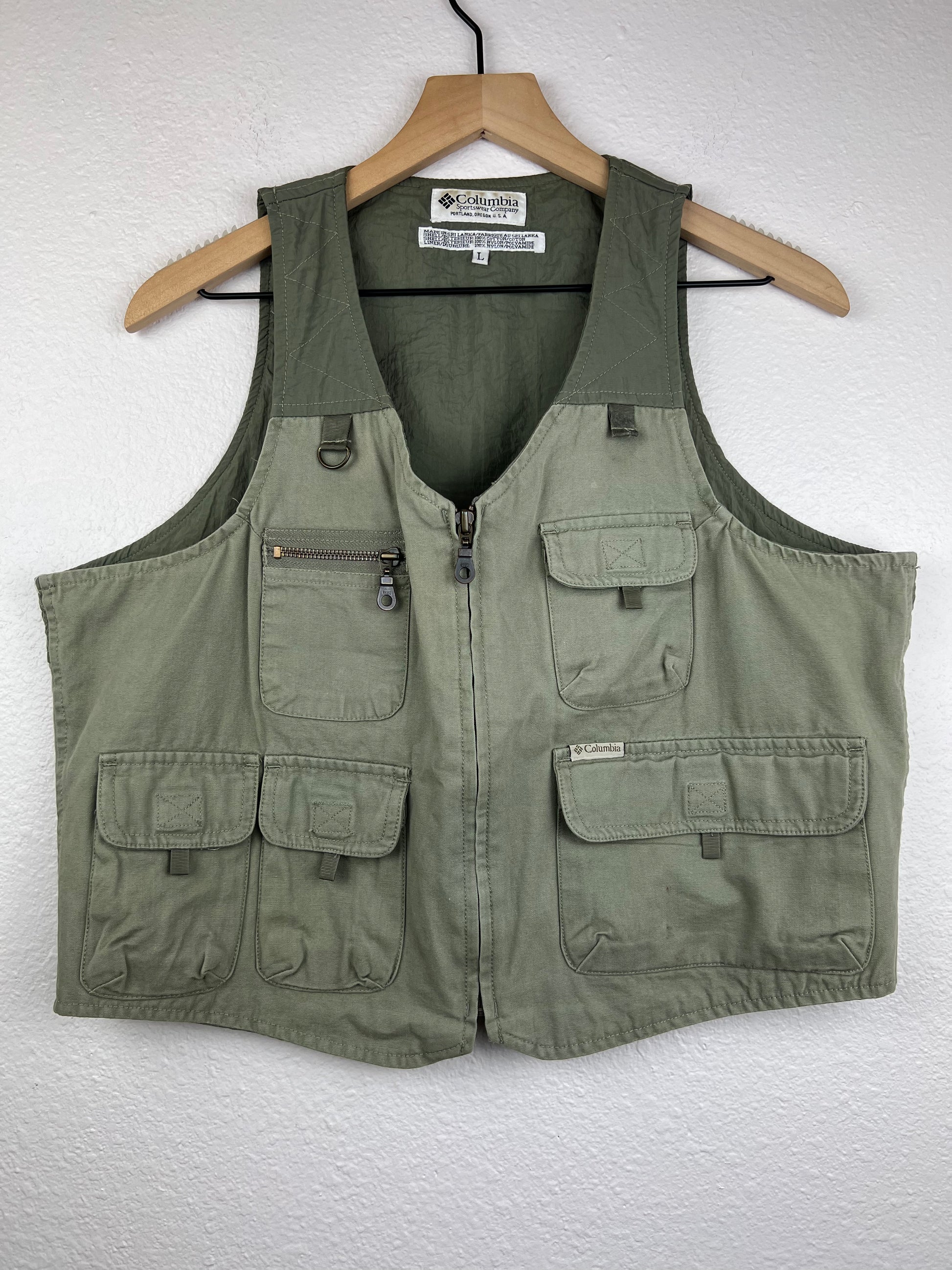 Vintage Columbia Sportswear fishing/outdoor utility army green colored vest. Made out of durable cotton and nylon sure to keep up with your active lifestyle or day to day around the town.