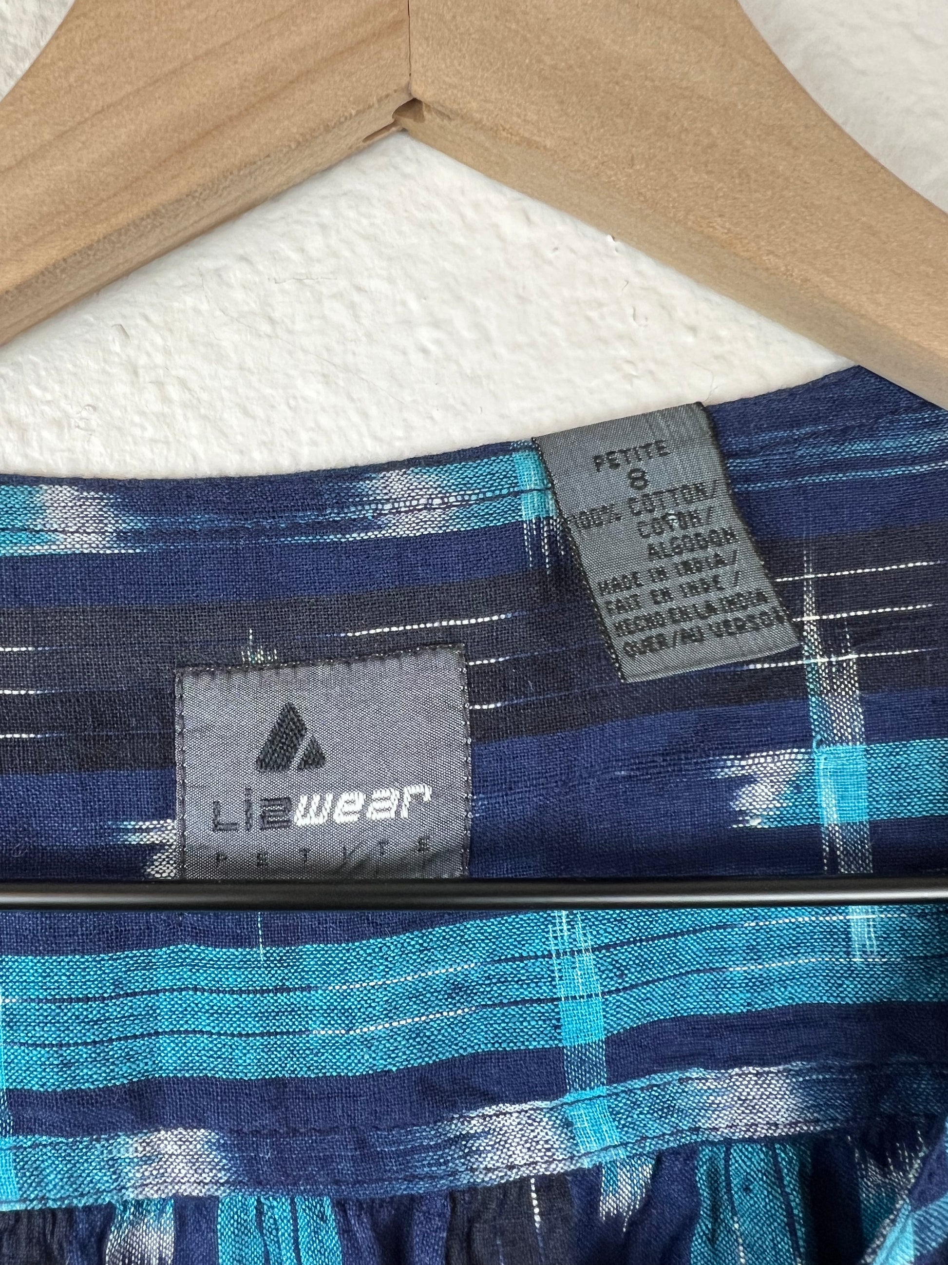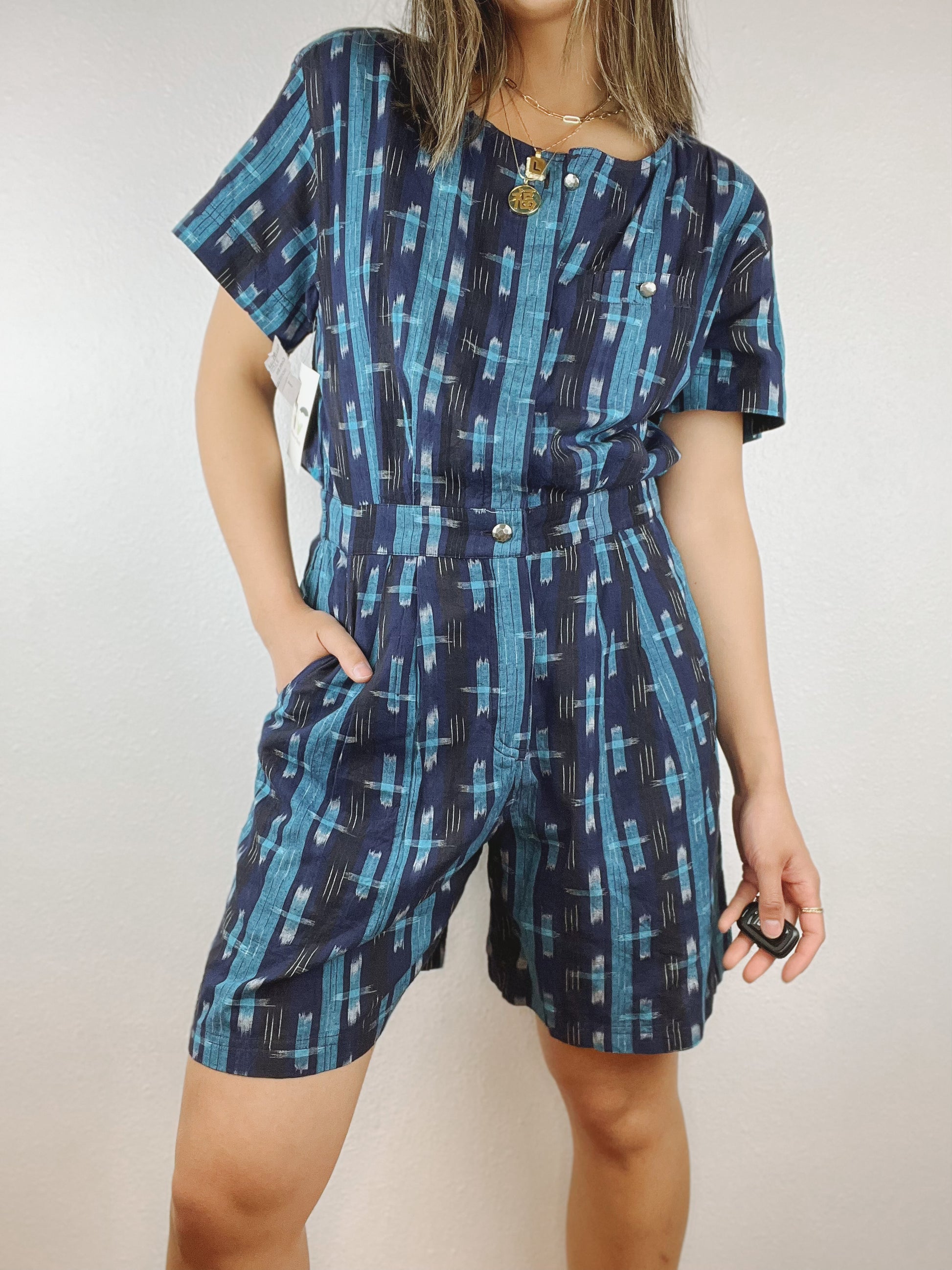 LizWear blue patterned button up romper with pockets! Features short sleeves, scoop neck, and stretchy waistband for a perfect fit.