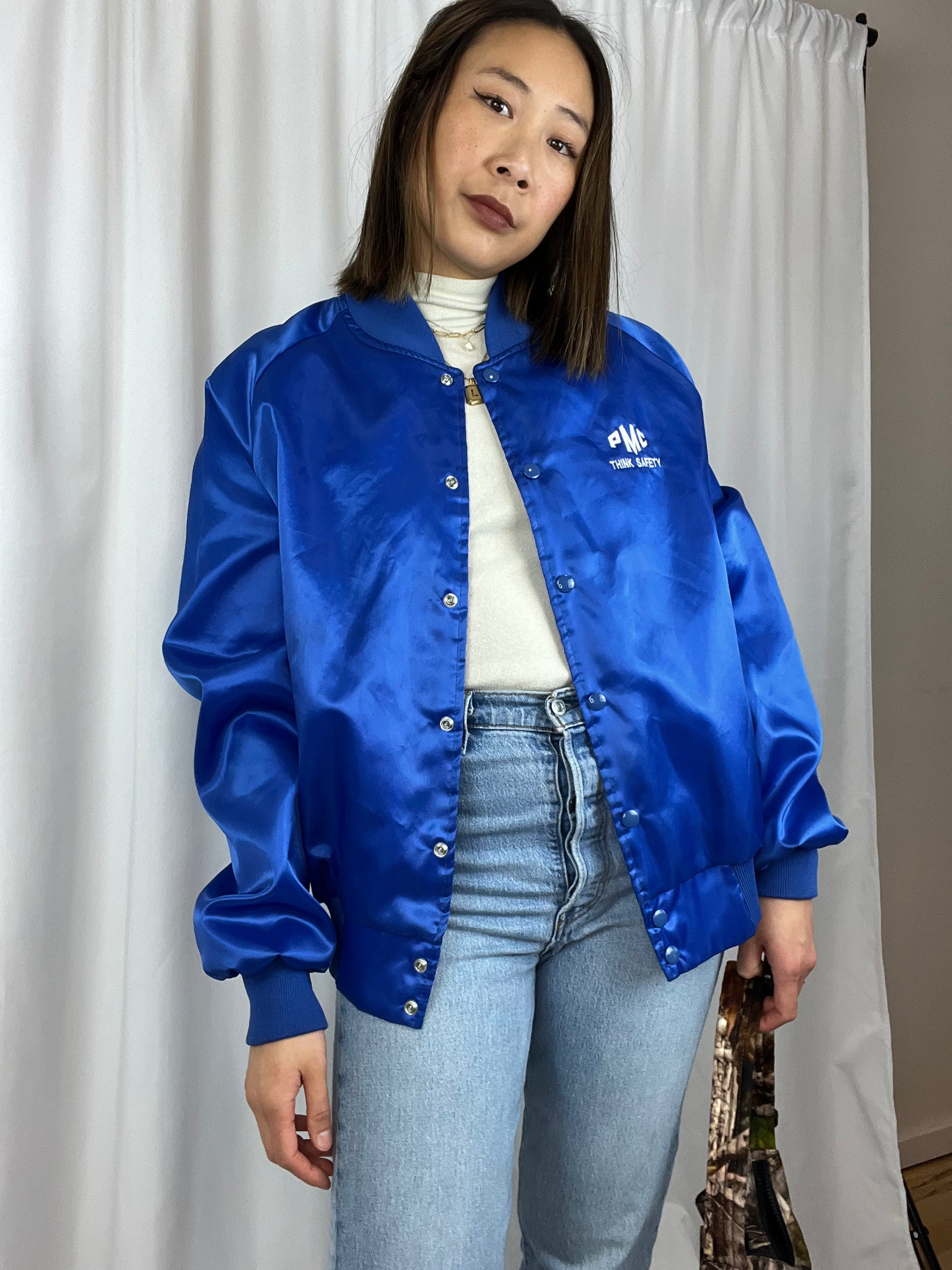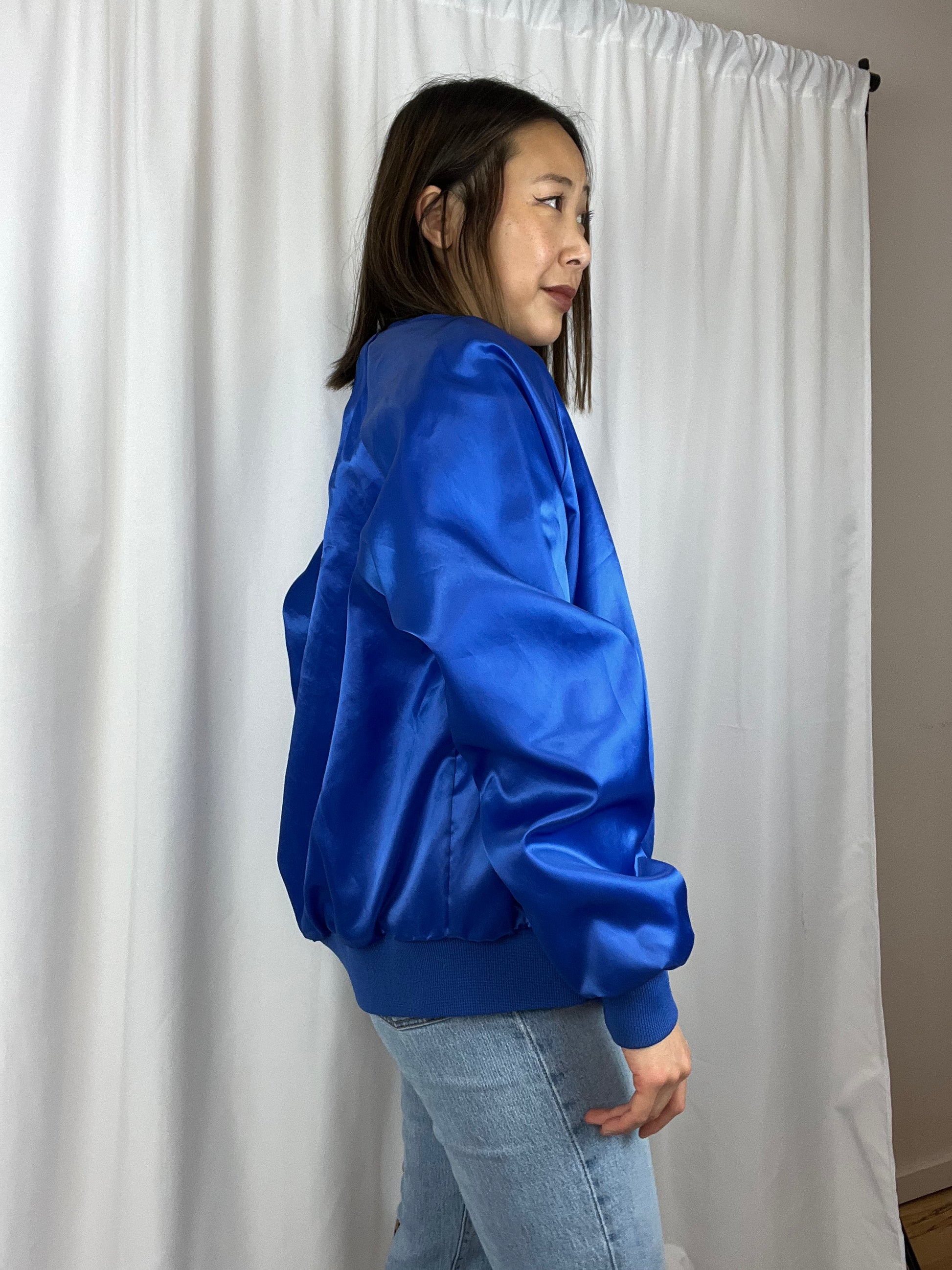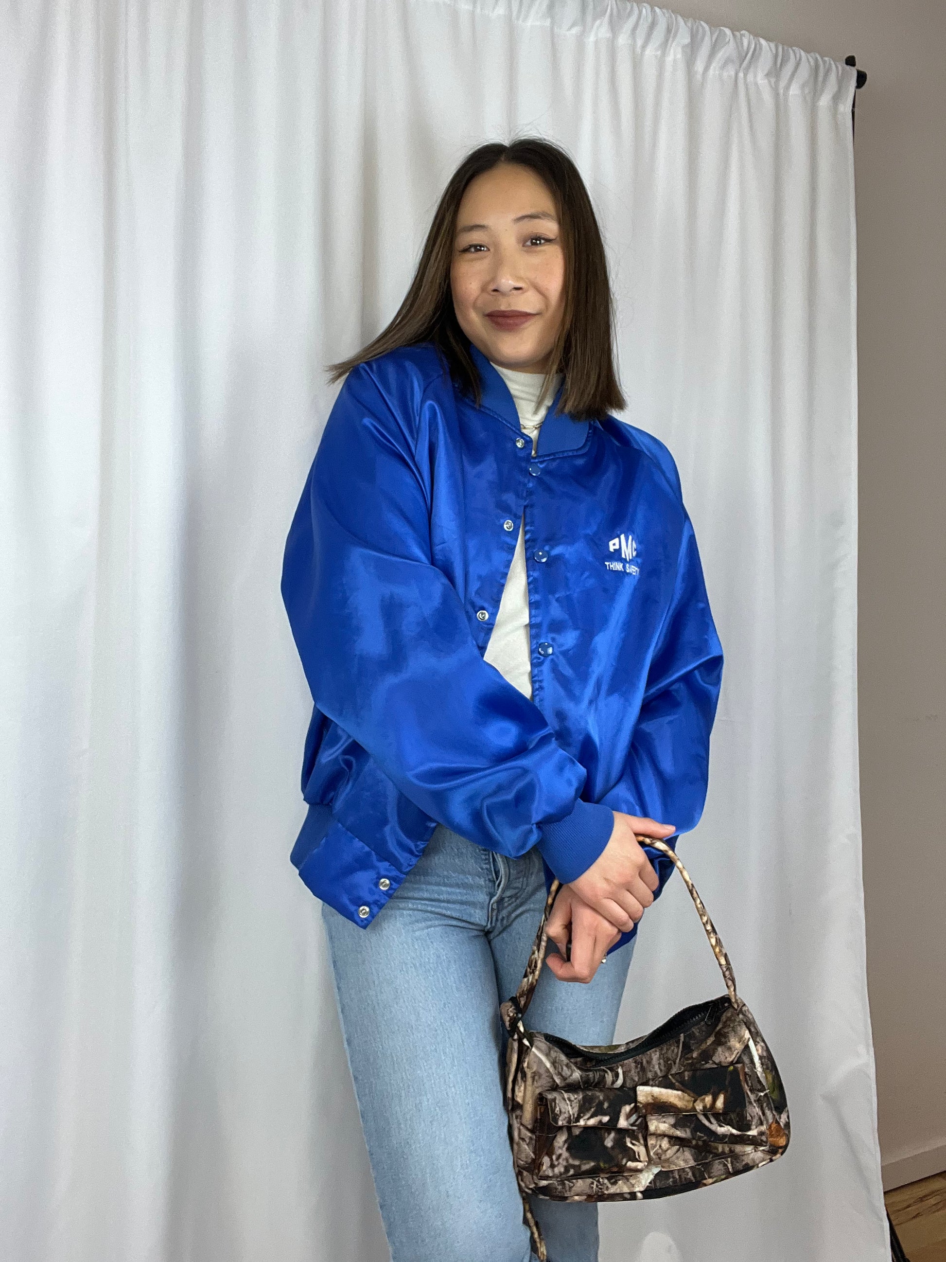 Lightweight shell with inner lining. This jacket has snap button front closure, two front pockets, cinched sleeves and hem. Features front and back embroidered detail.